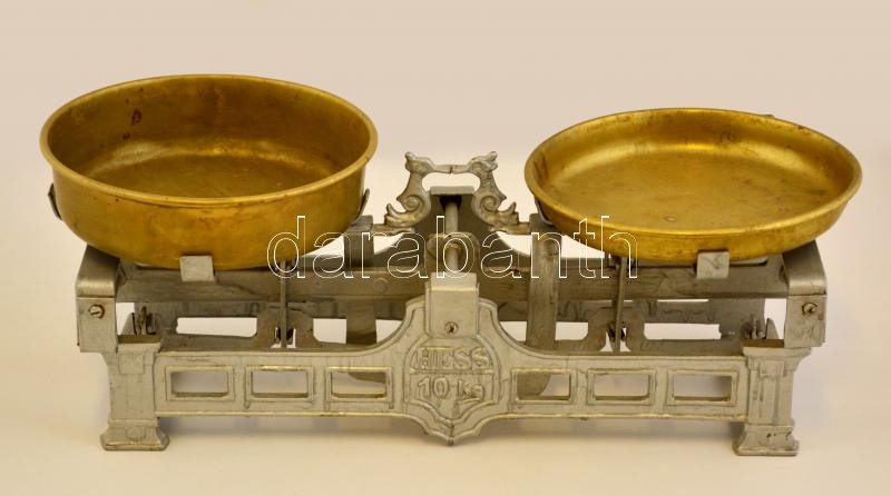 Hess régi mérleg (10 kg-ig), tálcákkal, 47×16×18 cm