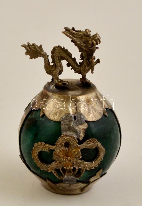 Jade gömb sárkányos fém foglalatban, m: 5,5 cm