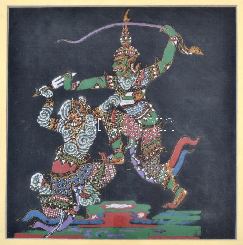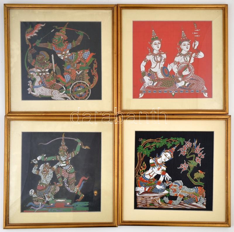 Távol keleti festett textil képek ( 6 db), üvegezett keretben ( egyben nincs üveg), 26×27 cm (6×)