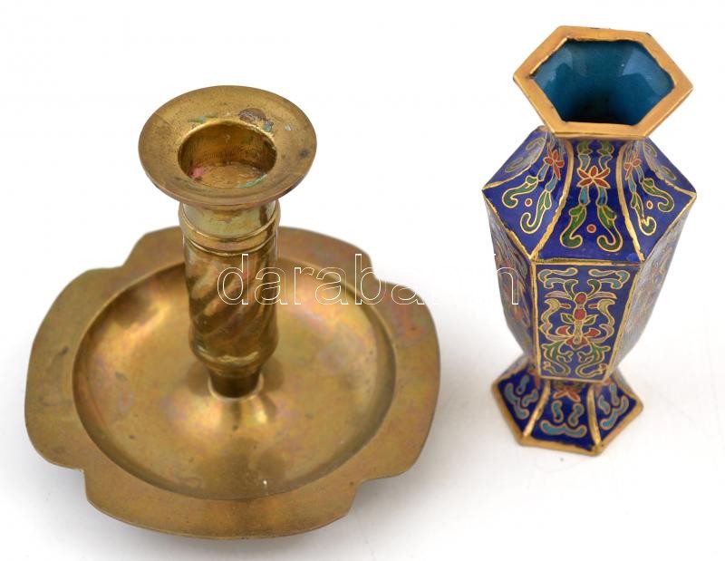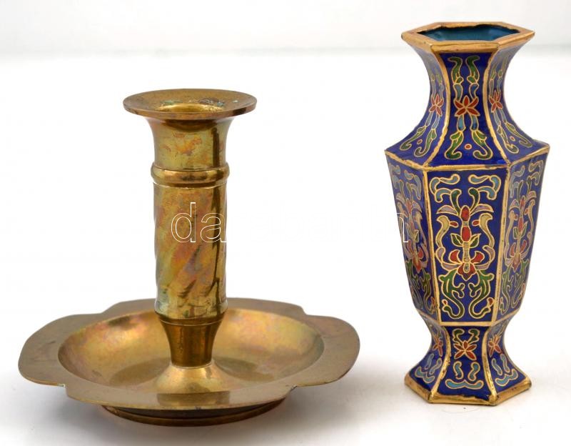Zománc díszített kis réz váza és réz gyertyatartó, m:10 és 8 cm