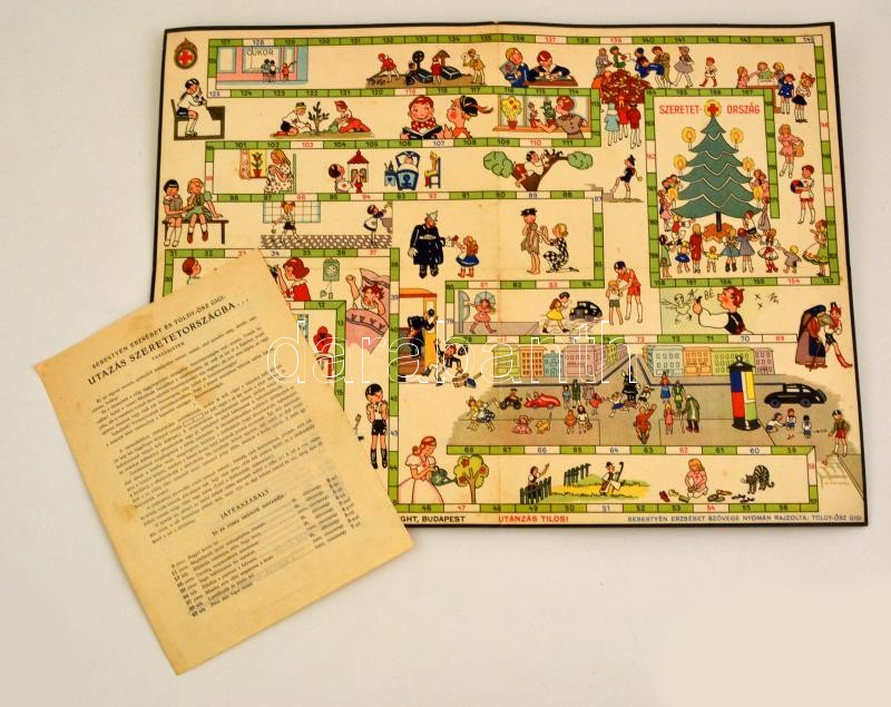 cca 1930 Sebestyén Erzsébet-Toldy-Ősz Gigi: Utazás Szeretetországba. Bp., Franklin. Társasjáték tábla, használati utasítással, kis szakadással.