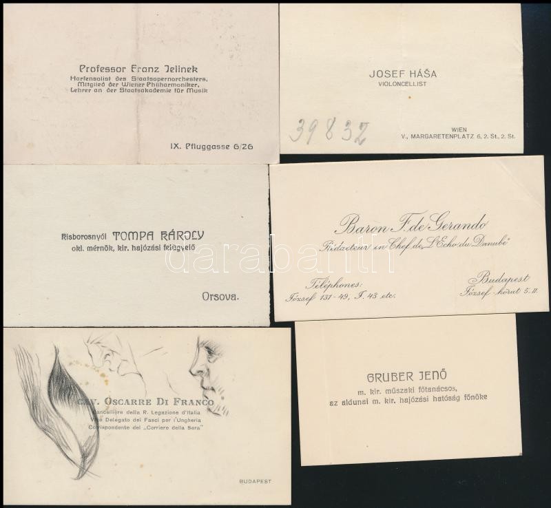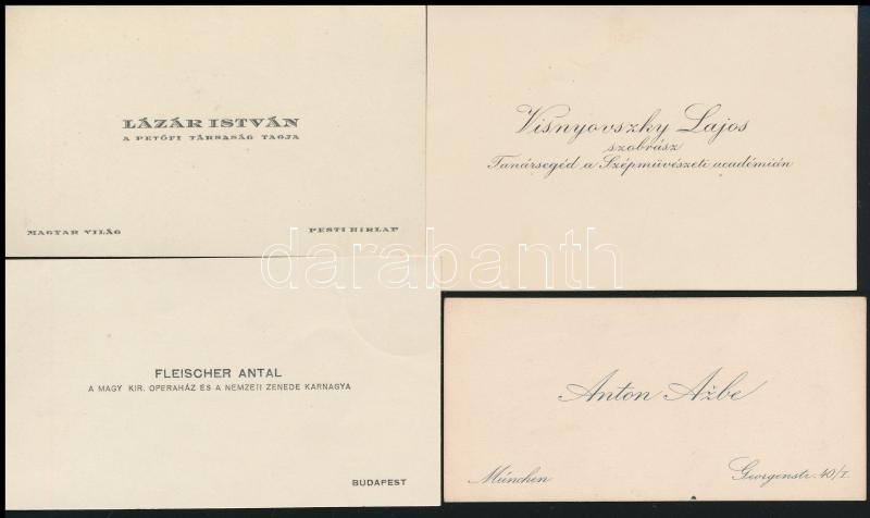 10 db régi névjegykártya, közte: Visnyovszky Lajos (1890-1973) szobrász, Csíkbarczfalvi és gamási Lázár István (1881-1936) író, költő, forgatókönyvíró, Petőfi Társaság tagjának, Fleischer Antal (1889-1945) M. Kir. Operaház és a Nemzeti Zenedének karnagyának névjegykártyája, a hátoldalán a felesége soraival, Anton Azbe (1862-1905) szlovén festő, Gruber Jenő m. kir. műszaki főtanácsos, az aldunai m. kir hajózási hatóság főnöke, Prof. Franz Jelinek Mozarteum zenetanára, Josef Hása csellóművész és mások névjegykártyáival.