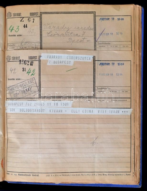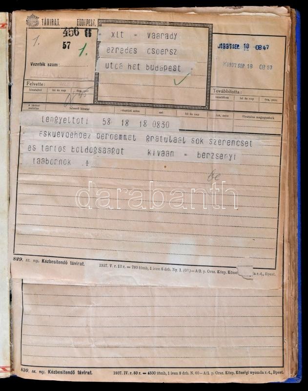 1937 Liska Gyula építészmérnök és Várady Eszter Désirée-nek, Várady Albert (1870-?) huszár ezredes, a m. kir. varasdi 10. honvéd huszárezred egykori tagjának lányának esküvői albuma, számos esküvői távirattal, közte magas rangú katonatisztek távirataival is, két nagyméretű esküvői fotóval (17x23 cm), egybekötve, benne egy esküvői kártyával, vászon kötésben.