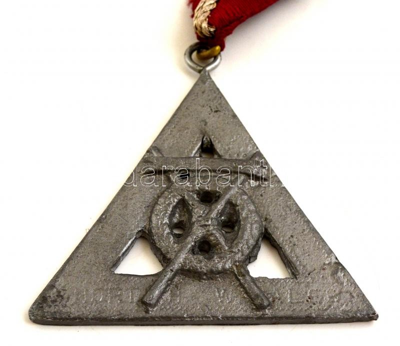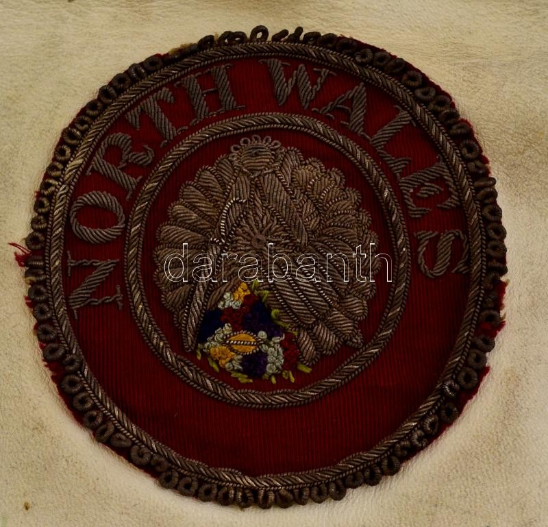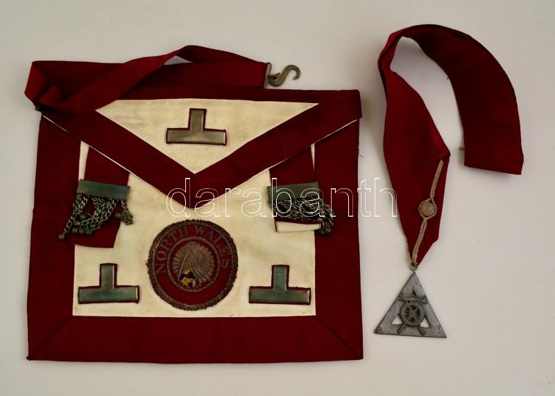 North Wales Szabadkőműves kötény és vállszalag, fém plakettel, bőr, textil, fém szerelékkel, kötény: 37x31 cm, szalag: 46x6 cm, medál: 7x8 cm./ North Wales Freemason apron and sash with jewel, leather, textile, and metal, apron: 37x31 cm, sash: 46x6 cm, jewel: 7x8 cm.