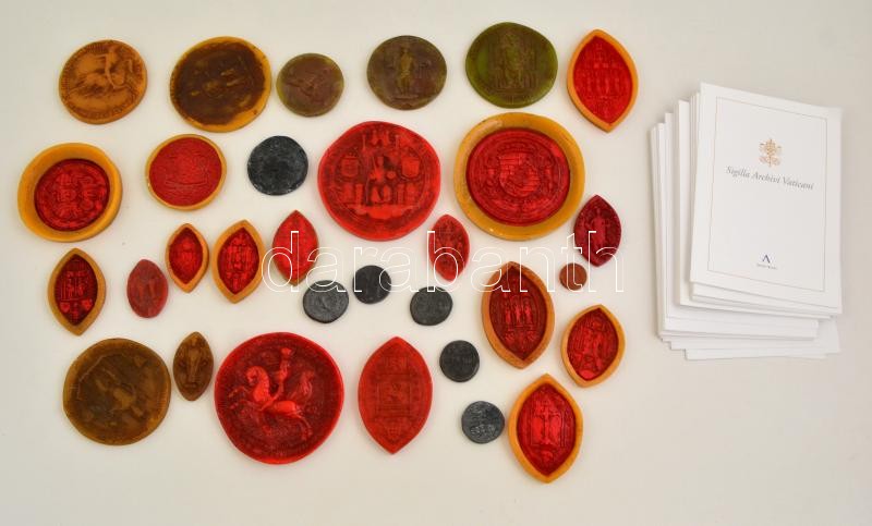 Sigillia Archivi Vaticani. A Vatikáni Levéltár pecsétjei. Az Archív kiadó által kiadott, limitált példányszámú, sorszámozott, névre szóló, viaszból készült pecsétgyűjtemény sorozat teljes anyaga. Összesen 31 db pecsét, mindegyikhez hozzávaló magyar nyelvű leírással, hozzá exkluzív bársonyborítású tartódobozzal.