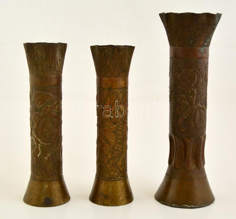 3 db rózsamintás töltényhüvelyből készült réz váza, m: 25 és 30 cm