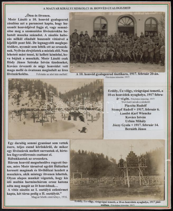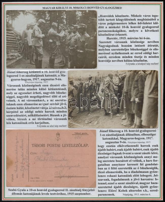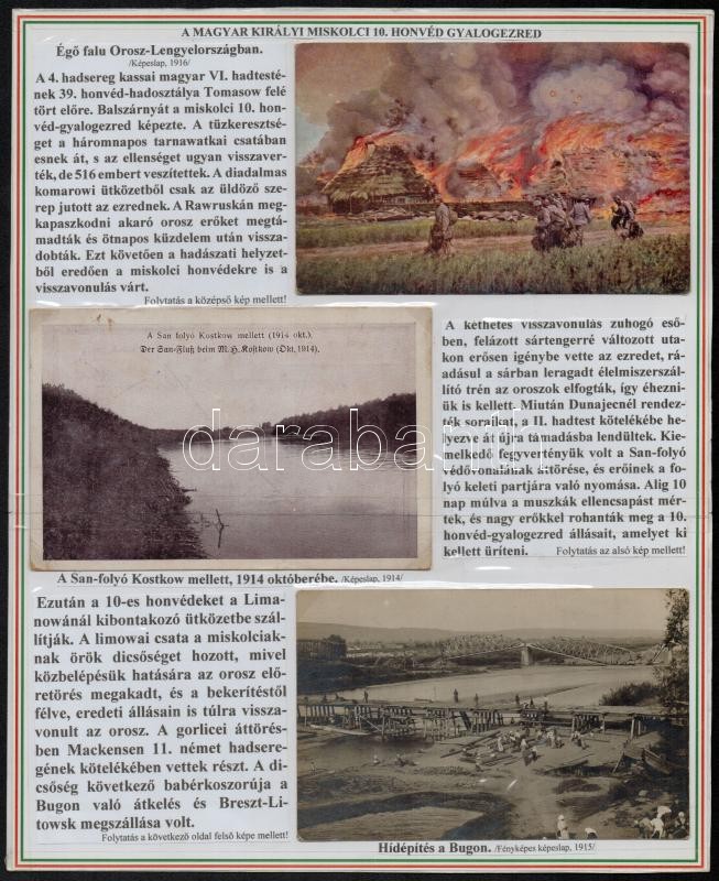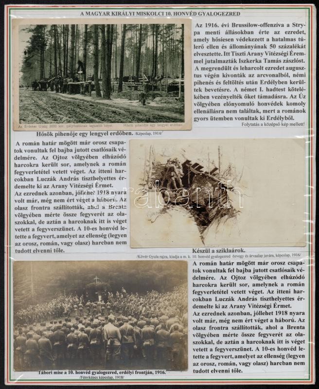 A magyar királyi 10. miskolci honvéd gyalogezred története. Különleges, egyedi összeállítás az első világháborús gyalogezredről,4 db nemzetiszín tablón részletes nyomtatott szöveggel, rajta 11 db eredeti képeslappal (képeslap, fotólap (1914-1918)), két fotólapon József főherceggel, 1 db tábori postai levelezőlappal, a képeslapok, fotók nincsenek felragasztva a tablókra./ History of 10th Hungarian Royal Army Infantry Regiment of Miskolc, with 11 pc. original postcards, with photos of Archduke Joseph of Austria on two photocards,1 pc. army field service postcards, on four sheets, not glued on the paper.