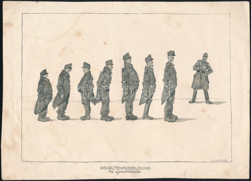 E. Kutzer: Újonckiképzés, litho nyomat, gyűrődésekkel, 18x25 cm