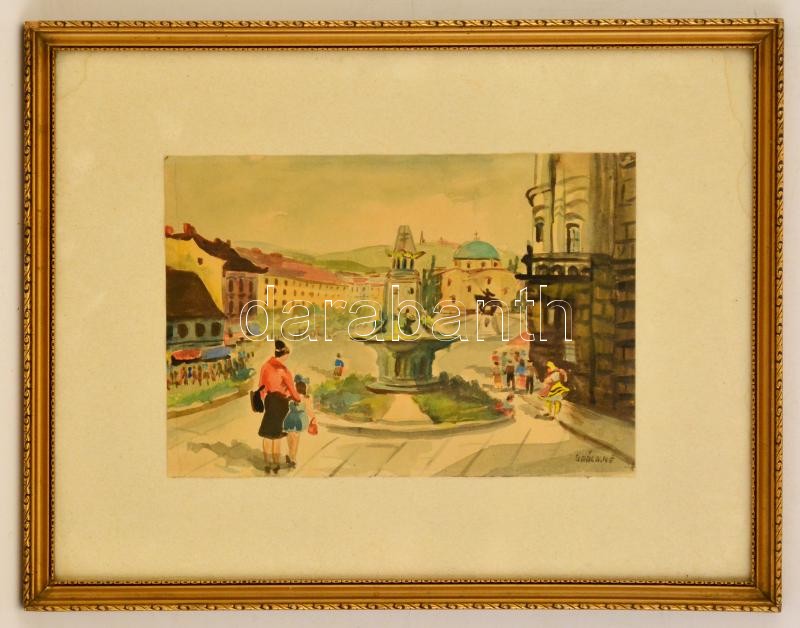 Gaálné jelzéssel: Pécs, Széchényi tér a Zsolnay kúttal, papír, akvarell, üvegezett fa keretben, 18x27 cm.