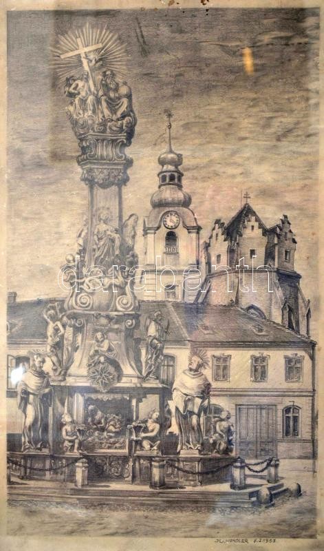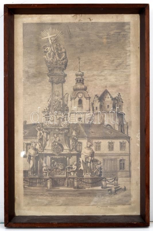 Handler jelzéssel: Főtér. Ceruza, papír, üvegezett keretben, 55×32 cm