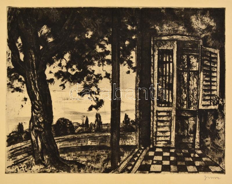 Imre István (1918-1983): Balatoni terasz. Rézkarc, papír, jelzett, 29,...