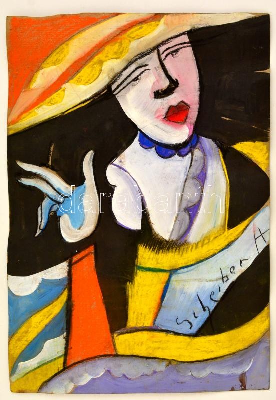 Scheiber jelzéssel: Kalapos hölgy. Vegyes technika, karton, 49x34 cm
