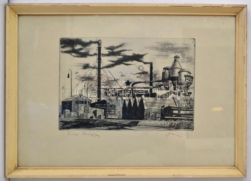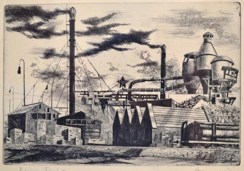 Olvashatatlan jelzéssel: Barcsi Fűrészüzem. Rézkarc, papír, üvegezett ...