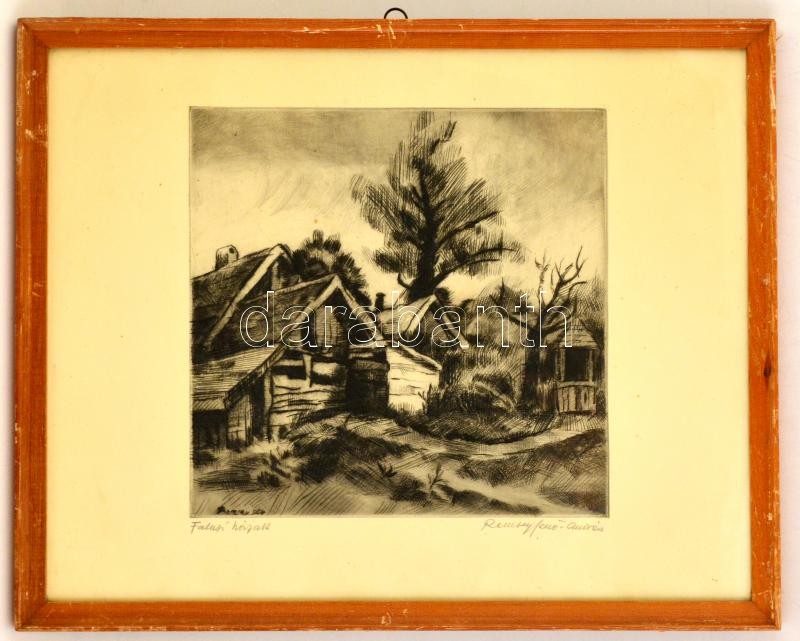 Remsey Jenő (1885-1970): Falusi házak, rézkarc, papír, jelzett, üvegezett fa keretben, 29×29,5 cm