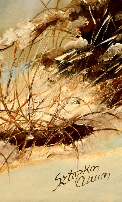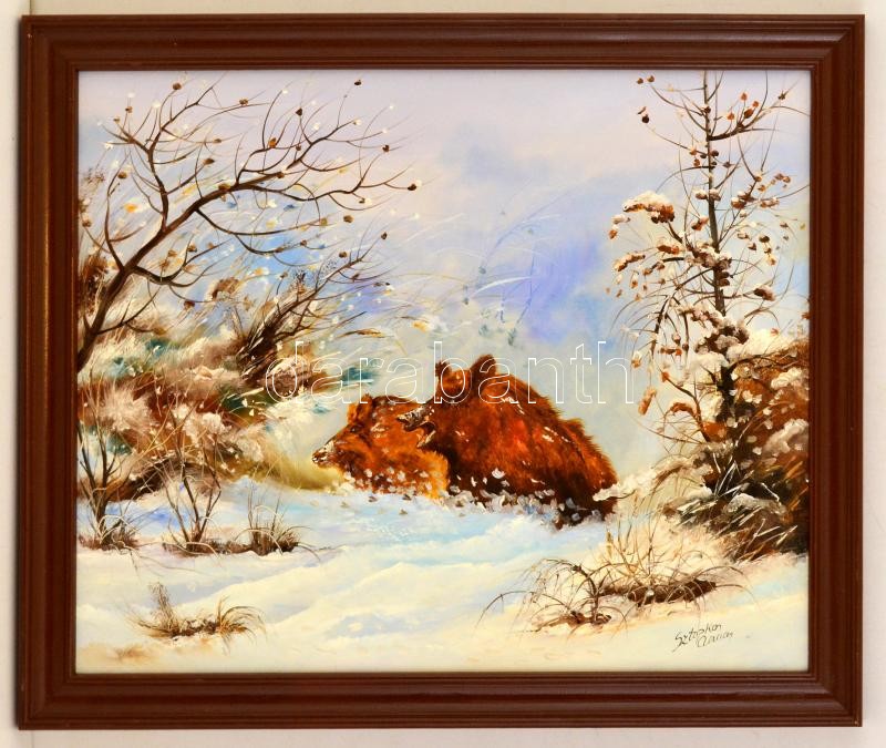 Sztopka Anna (1950-): Vaddisznók. Olaj, farost, jelzett, fa keretben, 39×49 cm
