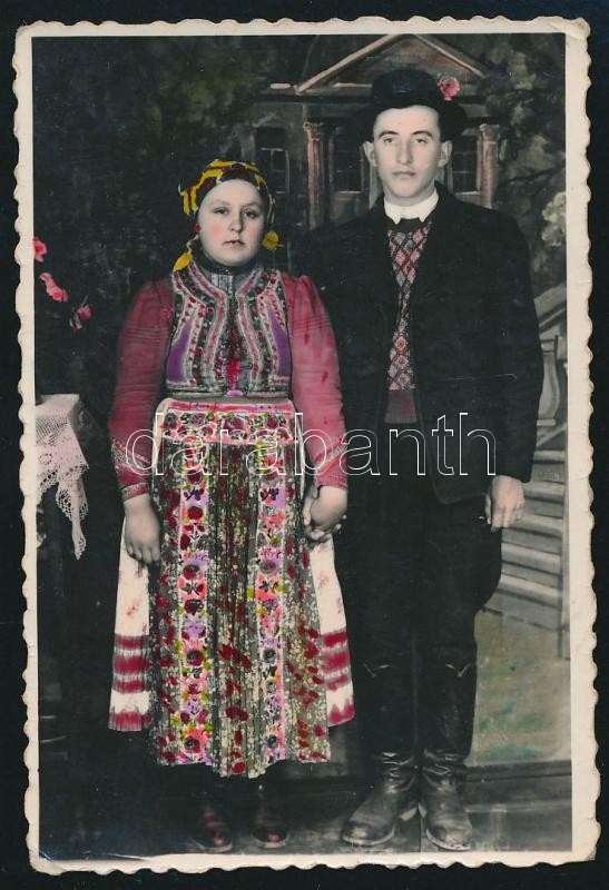 1955 Pár népviseletben, kézzel színezett fotó, 8,5×6 cm