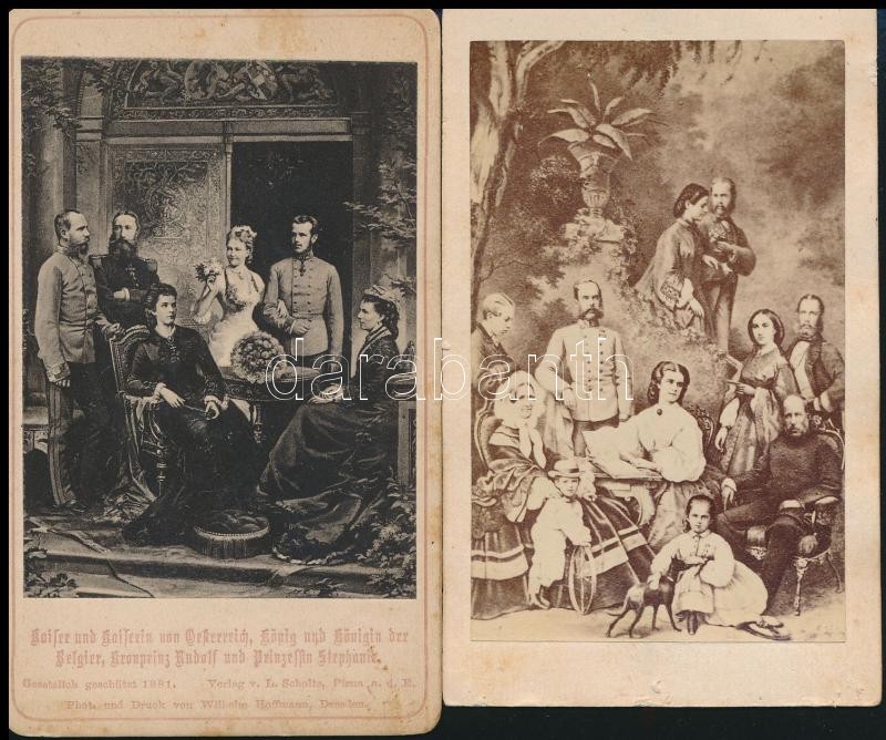 cca 1860-1880 Ferenc József Erzsébet (Sisi) és a császári család fénynyomaton, valamint Rudolf koronaherceg és Stefánia szüleikkel, 2 db fotó, 10×6 cm / Franz Joseph I of Austria, Sisi, Rudolf, Crown Prince of Austria, Princess Stéphanie of Belgium, 2 vintage photos