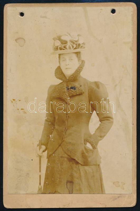 Description: cca 1880-1890 Domahidai Domahidy Ida (1864-1911) fotója, Domahidai Domahidy Ferenc (1824-1902), Szatmár vármegye főispánjának lánya, keményhátú fotó, foltos, sérült, 16x10 cm.