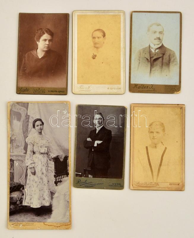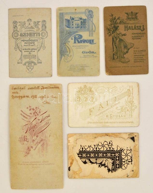 Description: cca 1880-1910 Portrék, 6 db keményhátú fotó vidéki műtermekből (Szigeti, Rákospalota-Újfalu; Fái, Gyula; Halász, Sátoaljaújhely; Rivoli, Győr, stb.), különböző méretben