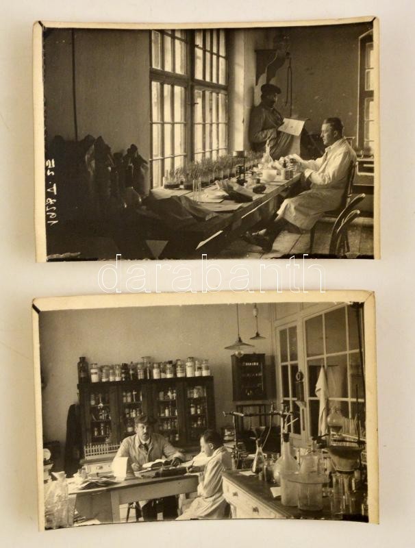 cca 1930 2db gyógyszertár, gyógyszerkészítő labor fotója. 6x9 cm