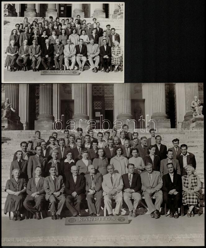 cca 1950 Szeged, Kárpitos Kisipari Termelő Szövetkezet tagjainak csoportképe a Móra Ferenc Múzeum lépcsőjén, 2 db fotó, 12x18 és 24x30 cm