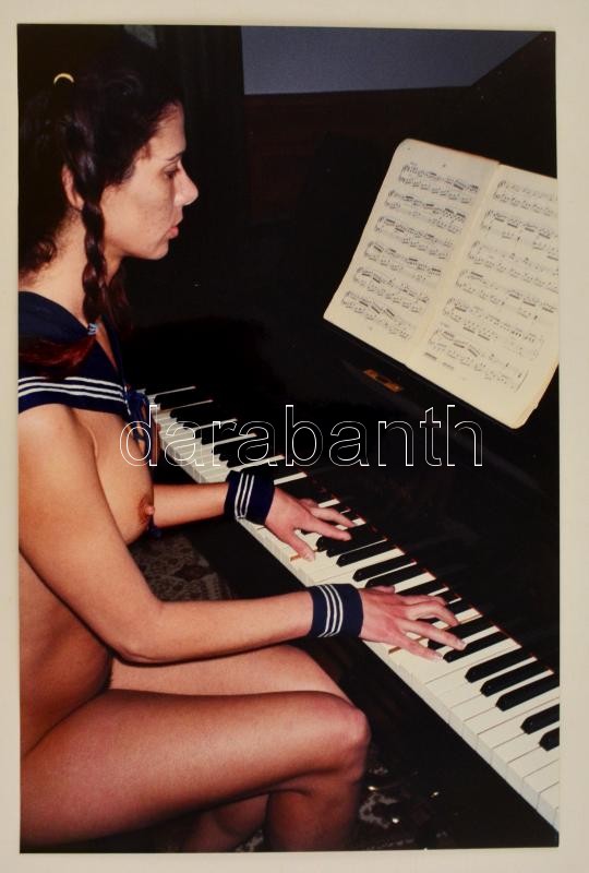 cca 1994 Menesdorfer Lajos (1941-2005) budapesti fotóművész hagyatékából, feliratozott vintage fotó (Fekete-fehér, a zongoránál), 40x26 cm