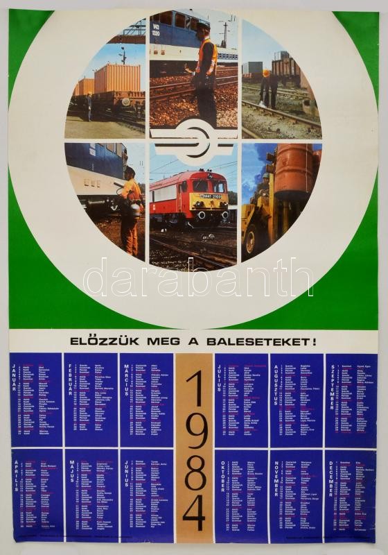 Description: 1984 "Előzzük meg a baleseteket", vasúti baleset-megelőzési plakát és naptár, Bp., MÁV-Vasutasok Szakszervezete,(Népszava-Offset-ny.), az egyik szélen kis gyűrődésekkel, 67x47 cm.