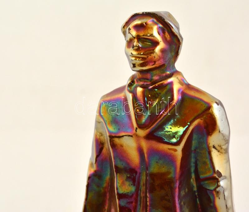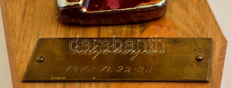 1972 Munkásőr, irizáló mázas fém szobor, fa talppal, felirattal, m: 24,5 cm