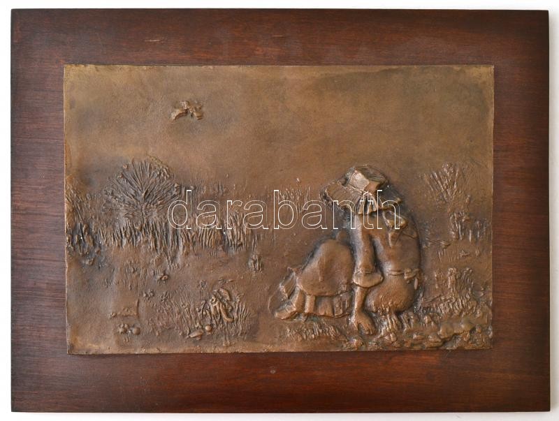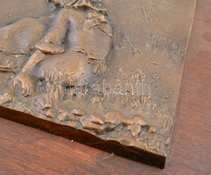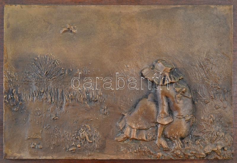 Üldögélő lány, bronz falikép, fa talapzaton, 21,5×30,5 cm