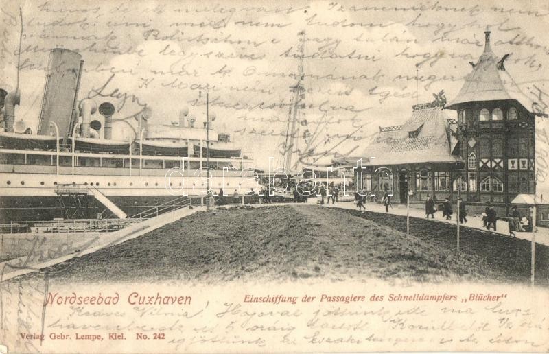 Cuxhaven, Nordseebad, Einschiffung der Passagiere des Schnelldampfers "Blücher" / Embarkation of the passengers of the steamship "Blücher"