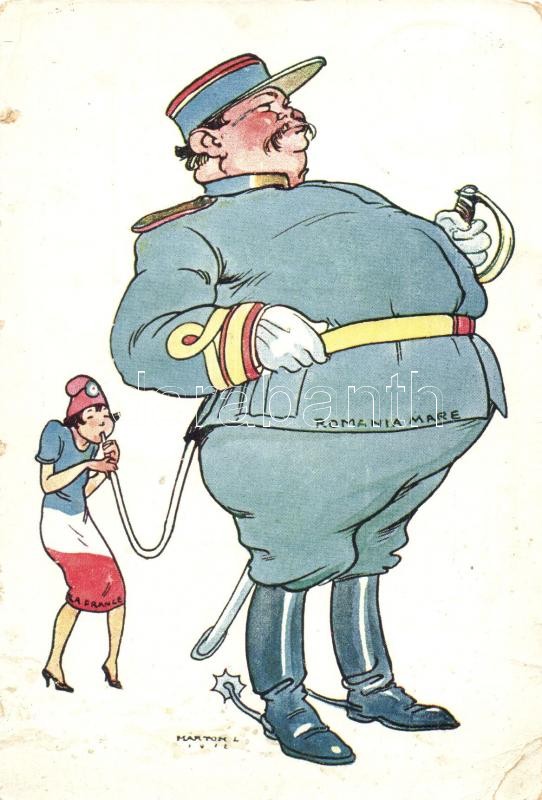 Description: Romania Mare / De mi lesz akkor ha a Magyar Igazság gombostűje hozzáér? Trianoni lapsorozat I. / Greater Romania, France. Anti-Romanian irredenta propaganda, '1938 Kassa visszatért' So. Stpl. s: Márton L. (kis szakadás / small tear)