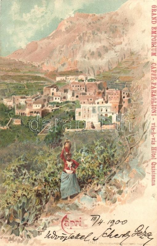 1900 Capri, Grand Emporium Caffé Faraglioni vis-a-vis Hotel Quisisana / hotel and cafe advertisement. Richter & Co. litho