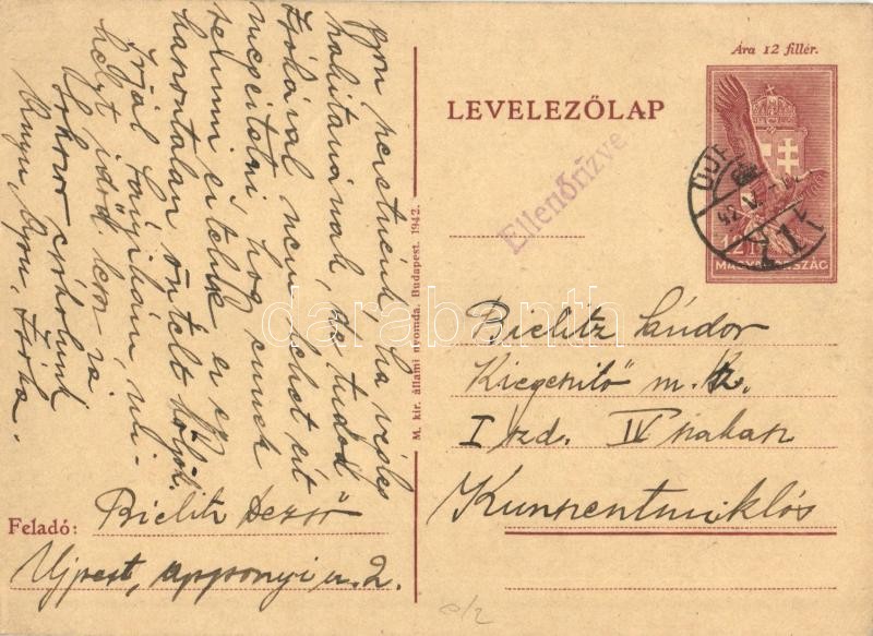 Description: 1942 Bielitz Dezső levele fiának Bielitz Sándor zsidó Kieg. msz. 1. szd. IV. szakasz KMSZ-nek (közérdekű munkaszolgálatos) a kunszentmiklósi munkatáborba / WWII Letter for a Jewish labor serviceman to the labor camp of Kunszentmiklós. Judaica + 12f Ga. (EK)