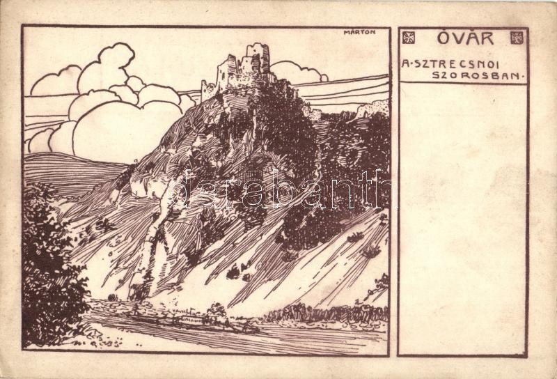 Description: "Zászlónk" Ifjúsági Tutaj expedíció Óvár várával a Sztrecsnói szorosban. Cserkész művészlap / Hungarian scout boy art postcard with Stary Hrad castle. s: Márton L. (EK)