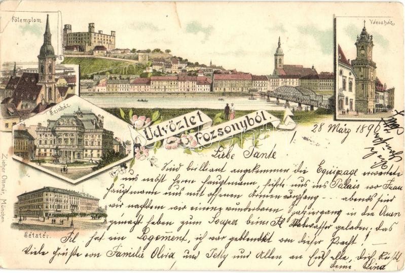 1896 (Vorläufer!) Pozsony, Pressburg, Bratislava; Főtemplom, színház, városház, sétatér / church, theatre, town hall, promenade. Ottmar Zieher floral, litho (szakadás / tear)