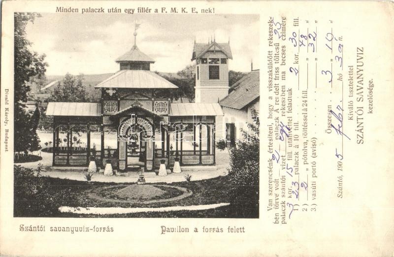 1905 Szántó, Santovka; Szántói savanyúvíz forrás, Pavilon a forrás fel... https://www.darabanth.com/en/329-Online-auction/329.0/Postcards/Slovakia~2000007/1905-Szanto-Santovka-Szantoi-savanyuviz-forras-Pavilon-a-forras-felett-Divald-Karoly-ki~II1836460