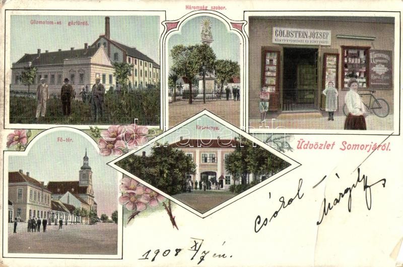 1908 Somorja, Somorin, Samorín; Gőzmalom és gőzfürdő, Háromság szobor, kaszárnya, Fő tér, Goldstein József üzlete és saját kiadása / steam mill and spa, statue, military barracks, main square, shop (fa)
