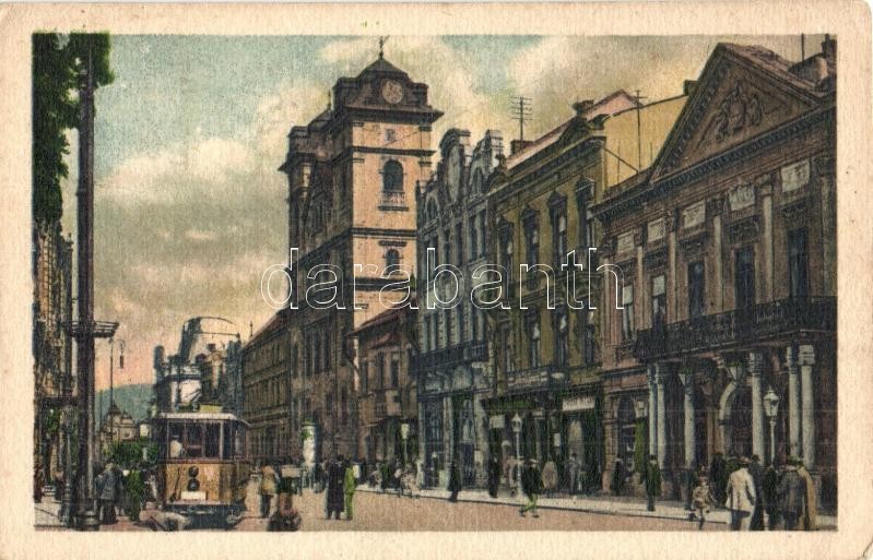 Kassa, Kosice; Hlavná ulica / Hauptstrasse / Fő utca, villamos, üzlete...