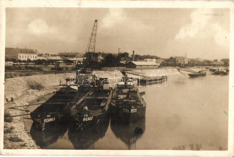 Komárom, Komárno; Duna part, CSD uszályok / Danube riverside, barges (apró lyuk / tiny hole)