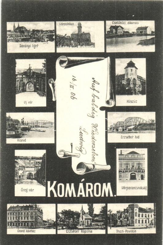 Komárom, Komárno; mozaiklap: Darányi liget, Városháza, Csallóközi vasútállomás, Új vár, Kőszűz, Kishíd, Erzsébet híd, Öreg vár, Várparancsnokság, Grand kávéház, Erzsébet kápolna, Tiszti pavilon. E. D. K. 175. / multi-view postcard: park, town hall, Zitny ostrov railway station, castle, statue, bridge, army headquarters, café, chapel, officers' pavilion