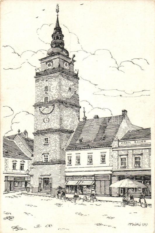 Nagyszombat, Tyrnau, Trnava; városháza tornya, Steinitz és fia és Karo...
