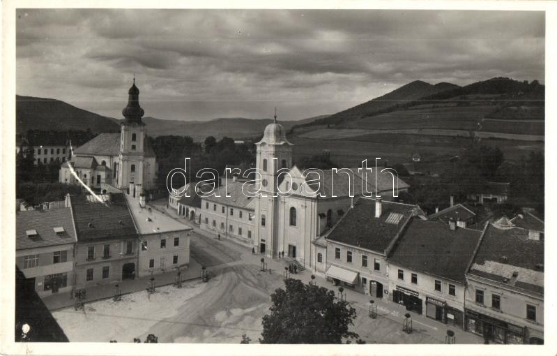 Rozsnyó, Roznava; Székesegyház és a premontrei gimnázium, Tátra Bank, Sztan, Schnitzer üzlete, Hangya szövetkezeti bolt, Sajó Vidék üzlete és saját kiadása / Cathedral, grammar school, bank, shops, cooperative shop, publisher's shop