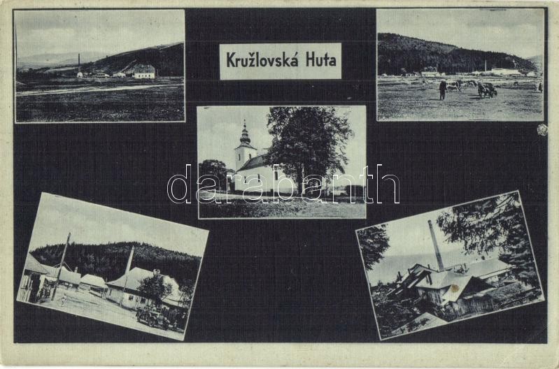 Ruzsolyhuta, Kruzlovská Huta (Bártfa, Bardejov); templom, utca autóval, üveggyár. Josef Melovsky kiadása / church, street view with automobile, glass factory (EK)