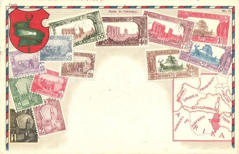 Tunis - Tunisian stamps, coat of arms, map. Carte Philatélique Ottmar ...
