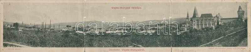 1902 Vajdahunyad, Hunedoara; Látkép, vár, 3 részes hatjott panorámalap / general vew, castle, 3-tiled panoramacard (hajtásnál kissé szakadt / bent till broken)