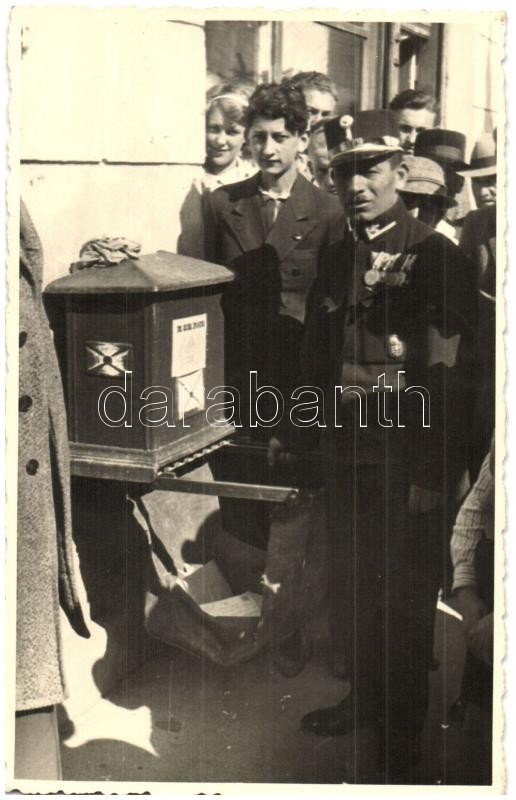 Description: 1940 Csíkszereda, Miercurea Ciuc; bevonulás, a magyar posta működésének megkezdése a magyar levélszekrény kihelyezésével / entry of the Hungarian troops, Hungarian post office starts to operate again after the placement of the Hungarian letterbox. Aladics photo + 1940 Csíkszereda visszatért So. Stpl. (EK)