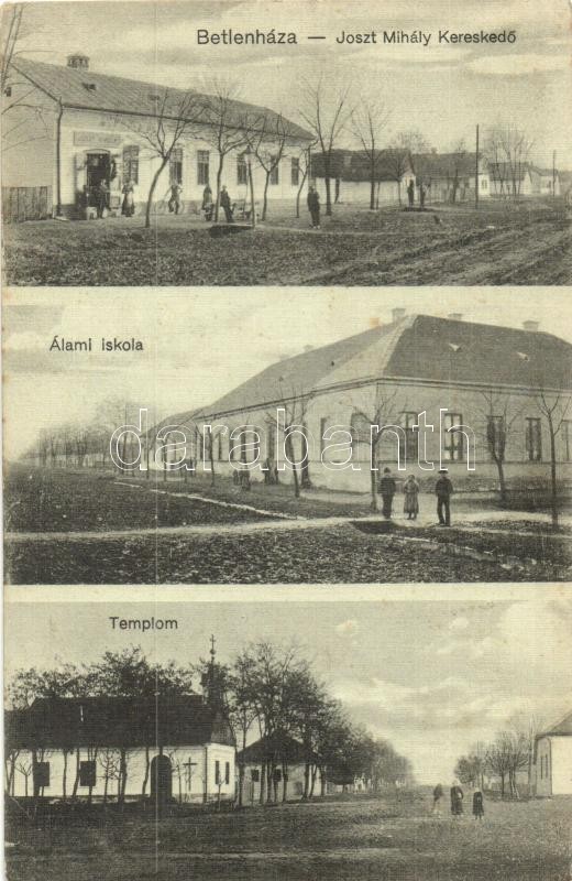 Description: Bethlenháza, Betlenháza, Bethausen; Joszt Mihály kereskedő üzlete, kerékpár, Állami iskola, templom. Kugel Károly fényképész / shop, bicycle, school, church