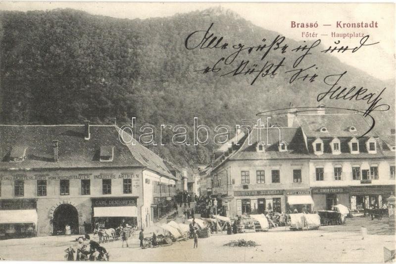 Brassó, Kronstadt, Brasov; Fő tér, Carl Dendorfer, Demeter Eremias, Moritz Krauss, Simon Ferenc üzlete, piaci árusok / Hauptplatz / main square, shops, market vendors (EK)