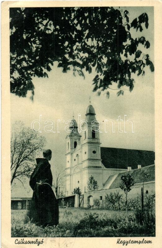Csíksomlyó, Sumuleu Ciuc; kegytemplom, szerzetes / church with monk (E...