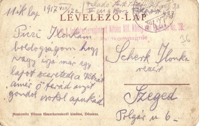 Désakna, Ocna Dejului; Sóbánya, Lajos tárna, akna, bányászok. Kiadja Moskovitz Vilmos / salt mine, adit, miners + K.u.K. Infanterieregiment Alfons XIII. König von Spanien No. 38. Feldkompagnie (kopott sarkak / worn corners)